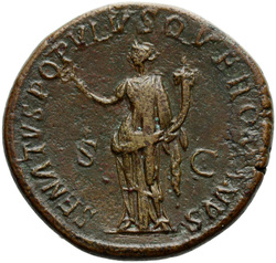 P M TR P COS VI P P S P Q R, Virtus, helmeted, in military dress, standing right, left foot set on helmet, holding vertical spear reversed in right hand and upright parazonium in left