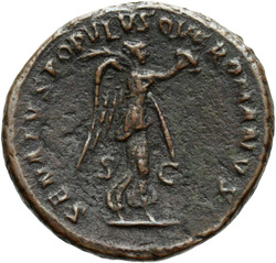 P M TR P COS VI P P S P Q R, Virtus, helmeted, in military dress, standing right, left foot set on helmet, holding vertical spear reversed in right hand and upright parazonium in left