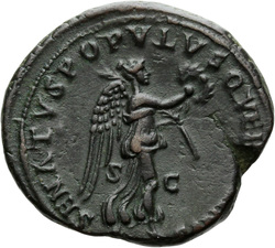 P M TR P COS VI P P S P Q R, Virtus, helmeted, in military dress, standing right, left foot set on helmet, holding vertical spear reversed in right hand and upright parazonium in left