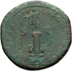 P M TR P COS VI P P S P Q R, Virtus, helmeted, in military dress, standing right, left foot set on helmet, holding vertical spear reversed in right hand and upright parazonium in left