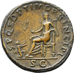 S P Q R OPTIMO PRINCIPI, Abundantia, draped, standing left, holding corn-ears downwards in right hand over modius with corn-ears, left, and cornucopiae in left hand; to right, prow of ship