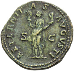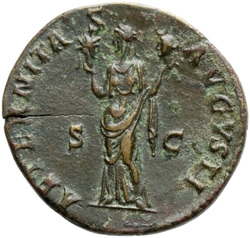 P M TR P COS III // S C (in field), Minerva, helmeted, draped, standing left, placing incense in candelabrum with right hand and holding vertical spear in left; on ground to right, shield containing snake; to left, candelabrum