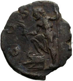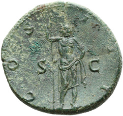 COS III // S C (in exergue), Roma seated left on cuirass, resting foot on helmet, holding Victory and spear; behind, shield