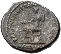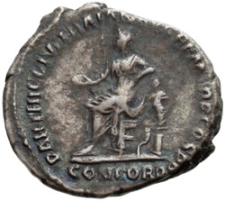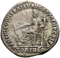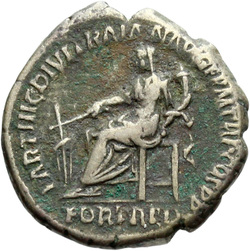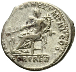 PON[T] MAX TR POT COS DES II // FORT RED (in exergue) // S C (in exergue), Fortuna, draped, seated left on low chair, feet on stool, holding rudder set on ground in right hand and cornucopiae in left