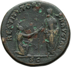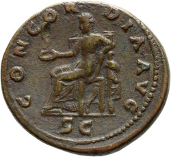 CONCORDIA AVG // S C (in exergue), Concordia seated left, holding patera and resting arm on Spes, cornucopia below throne