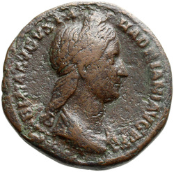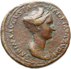 SABINA AVGVSTA HADRIANI AVG P P, ust of Sabina, wreathed with possible corn wreath, wearing stephane with hair in queue, draped, left