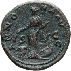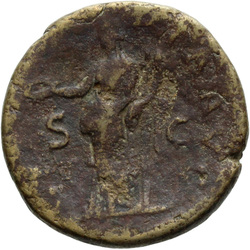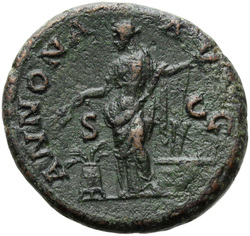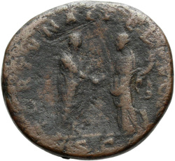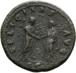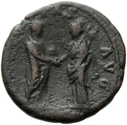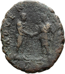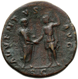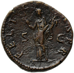 FELICI[TAS] AVG // S C (in exergue), Hadrian standing right, holding scroll and greeting Felicitas, standing left, holding caduceus