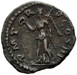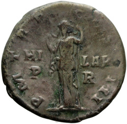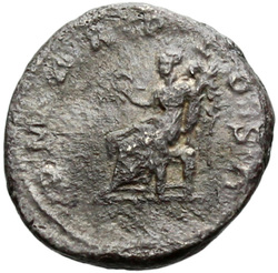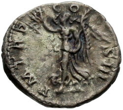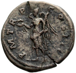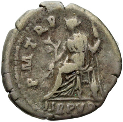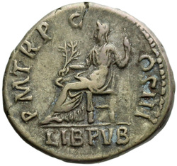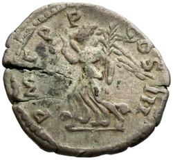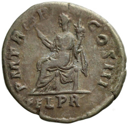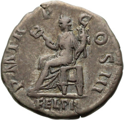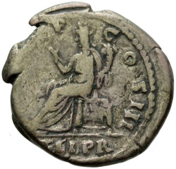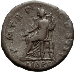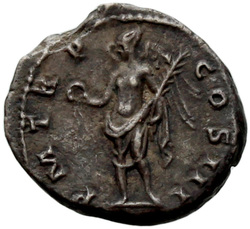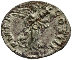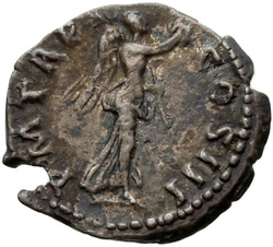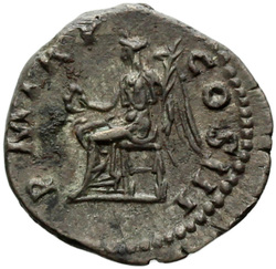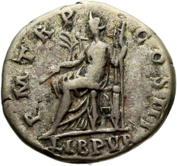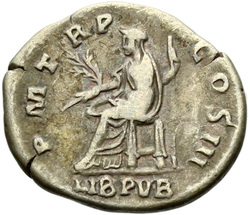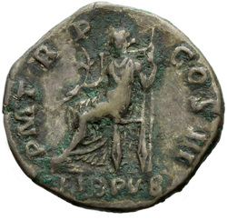 P M TR P COS III, Victory seated left, holding wreath and palm, wings half raised, far wing framing head