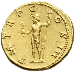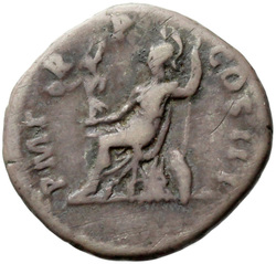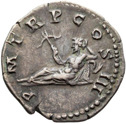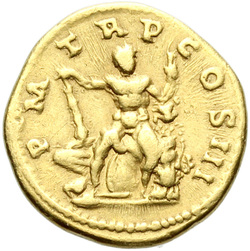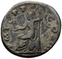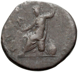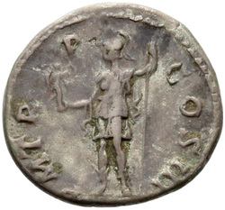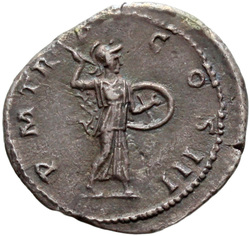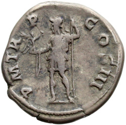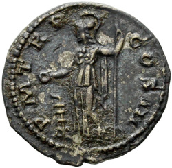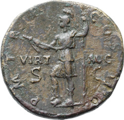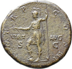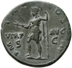 P M [T]R P COS III // VIRT AVG // S C (in field), Virtus, helmeted, in military attire, standing left, resting foot on helmet, holding parazonium in right hand and vertical spear in left