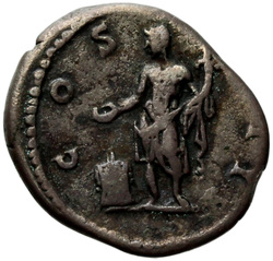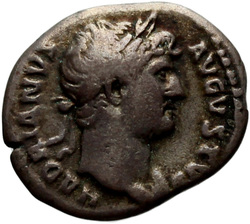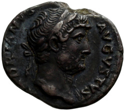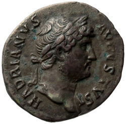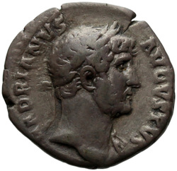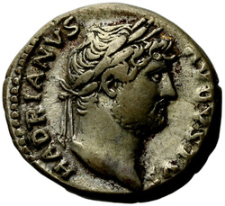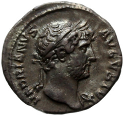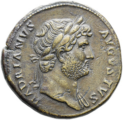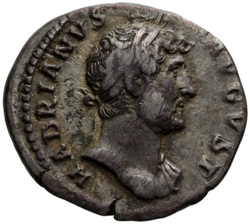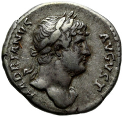 HADRIANVS AVGVSTVS, Head of Hadrian, laureate, traces of drapery on far shoulder, right
