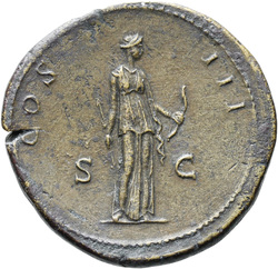 COS III // EXPED AVG (in exergue) // S C (in field), Hadrian, in military attire, cloak flying behind, riding right, raising right hand and holding horizontal spear in left