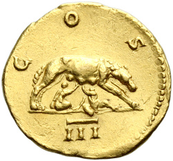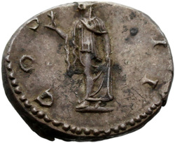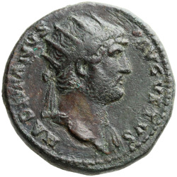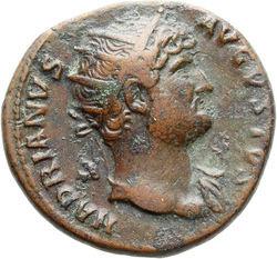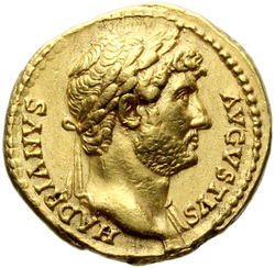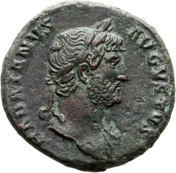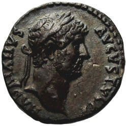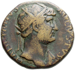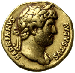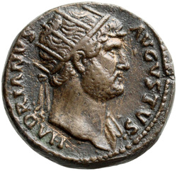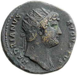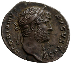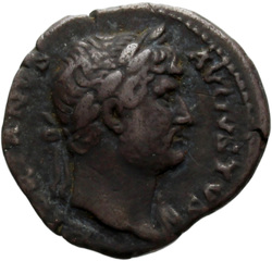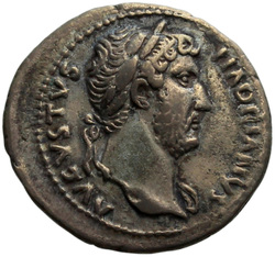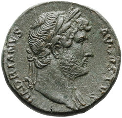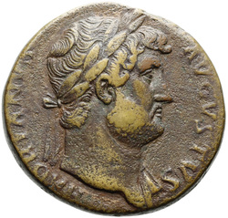 [H]ADRI[ANVS] AVGVSTVS, Head of Hadrian, laureate, traces of drapery on far shoulder, right