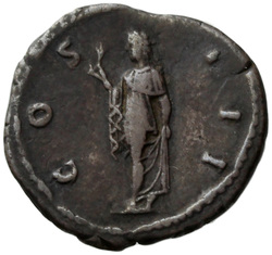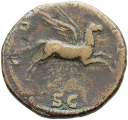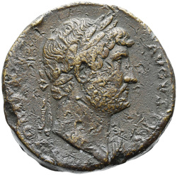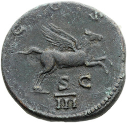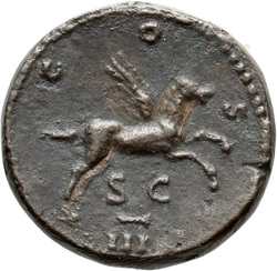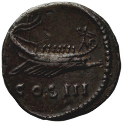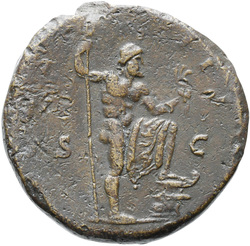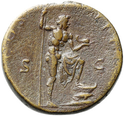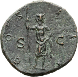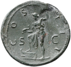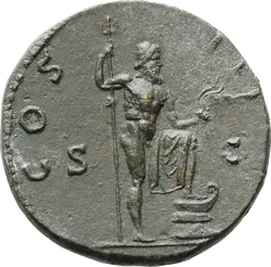 COS III // S C (in field), Neptune, naked except for cloak over left leg, standing right, resting foot on prow, holding vertical trident in right hand and acrostolium in left