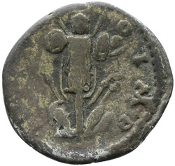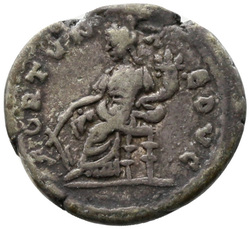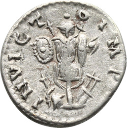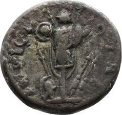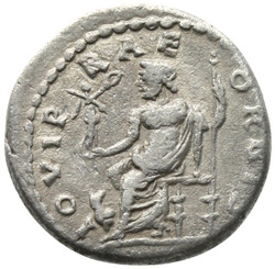 IOVI PRAE ORBIS, Jupiter, naked to waist, seated left on low seat, holding Victory in extended right hand and sceptre in left hand; at feet, left, eagle