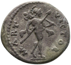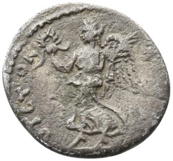 [MARTI VI]C[T] / [MARTI VI]C[TOR] / [MARTI VI]C[TORI], Mars, helmeted, naked except for cloak tied round waist, advancing right, holding transverse spear in right hand and trophy over left shoulder in left hand