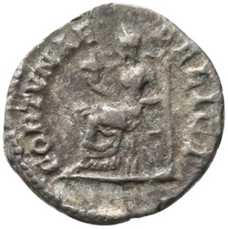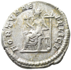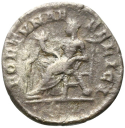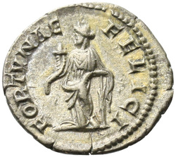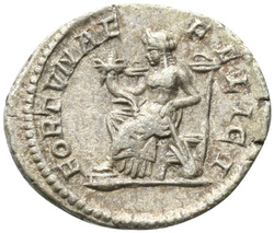 FORTVNAE FELICI, Fortuna, draped, seated left on low seat, holding cornucopiae in right hand and rudder set on globe in left hand; before her, child standing