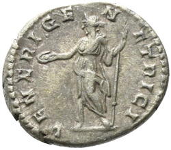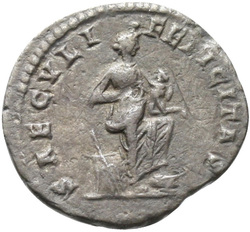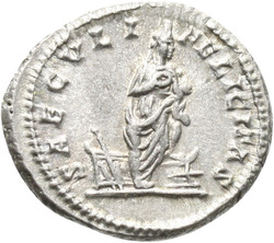 S[A]ECVLI FELICITAS, Isis, wearing polos, standing right, left foot on prow, with the infant Horus at her breast; to left, altar, against which rests a rudder