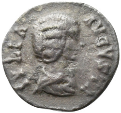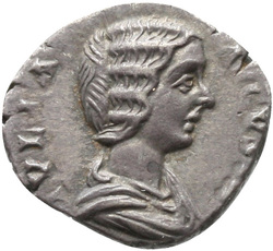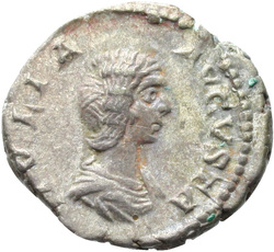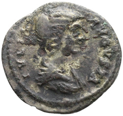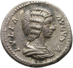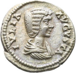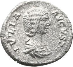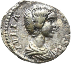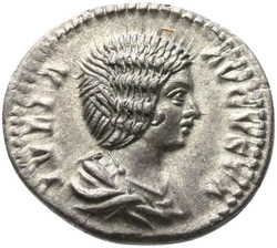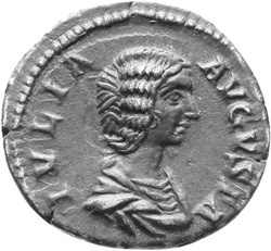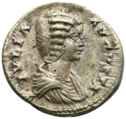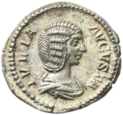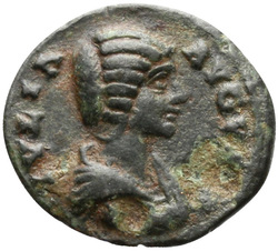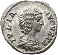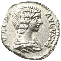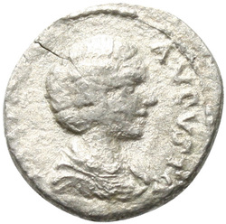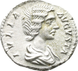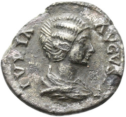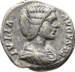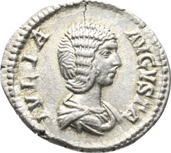 IVLIA AVGVSTA, Bust of Julia Domna, hair waved and coiled at back with queue at neck, draped, right