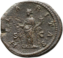 [P] M TR P IIII COS II P P S C, Jupiter, naked except for cloak on shoulders, standing left, holding Victory in extended right hand and vertical sceptre in left hand; at feet, left, eagle