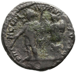 P M TR P V COS II P P, Genius, standing left, sacrificing with patera in right hand over lighted and garlanded altar, left, and holding corn-ears in left hand