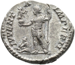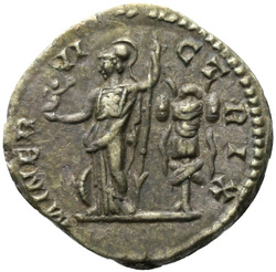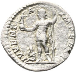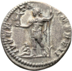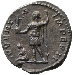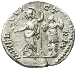 MINER VICTRIX, Minerva, helmeted, draped, standing left, holding Victory in extended right hand and spear in left hand; at feet, shield; behind, trophy