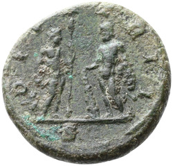 DI P[A]TRII S [C], Bacchus, naked, standing right, holding cup downwards in right hand and thyrsus in left hand, facing Hercules, naked, standing left, resting right hand on club set on ground and holding lion-skin over left arm; left of Bacchus, leopard