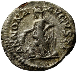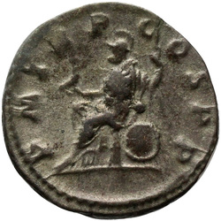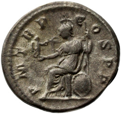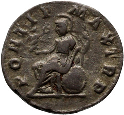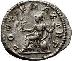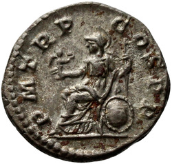 PONTIF MAX TR P, Roma, helmeted, draped, seated left, holding Victory in extended right hand and sceptre in left hand; by her side, shield