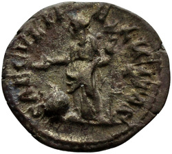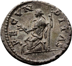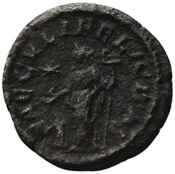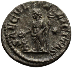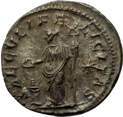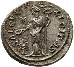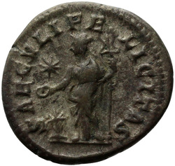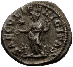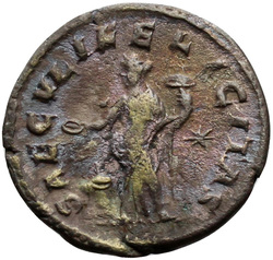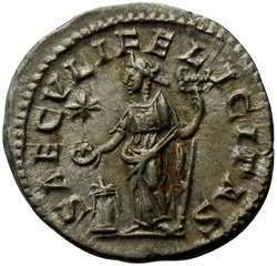 [S]AECVLI FELICITAS, Felicitas, draped, standing left, sacrifcing with patera in right hand over lighted altar and holding long caduceus in left hand; in right field, star
