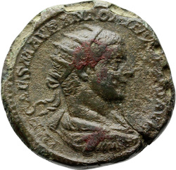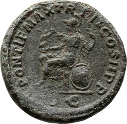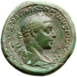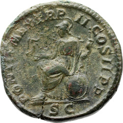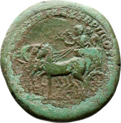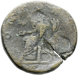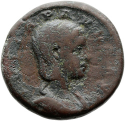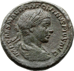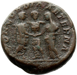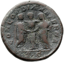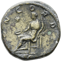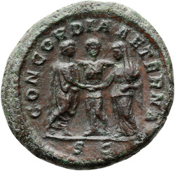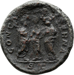 CONCORDIA AETERNA [S C], Elagabalus, togate, and Julia Paula, draped, standing right and left, facing each other, clasping right hands; between them, Concorida, draped, standing front