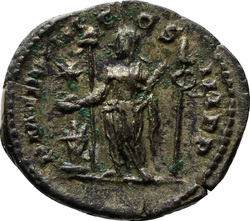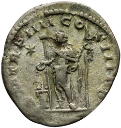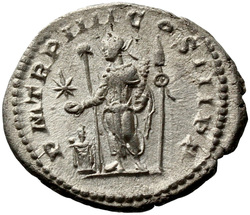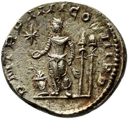 [P] M TR P IIII COS III P P, Elagabalus, in Syrian priestly robes, standing left, sacrificing out of patera in right hand over lighted altar, and holding branch (of cypress ?) in left hand; to either side, standard; in left field, star