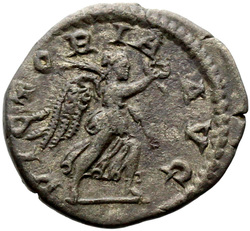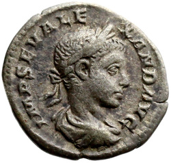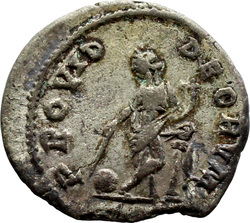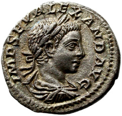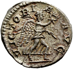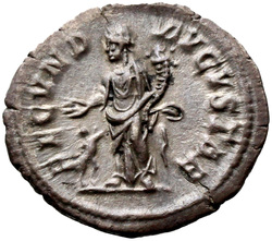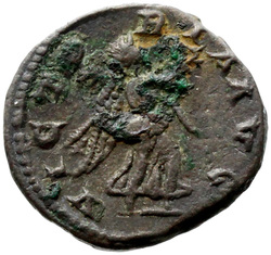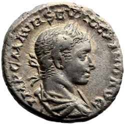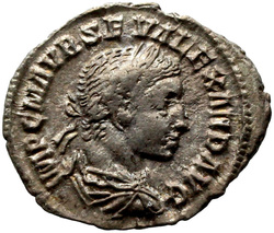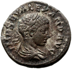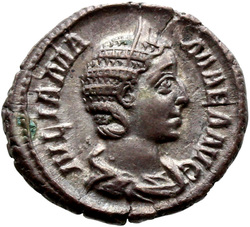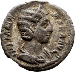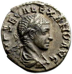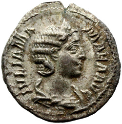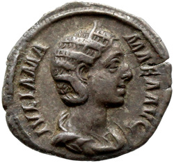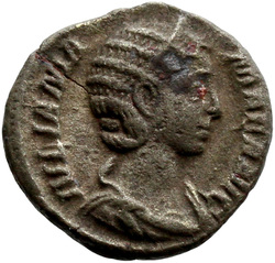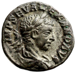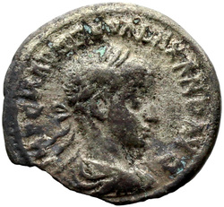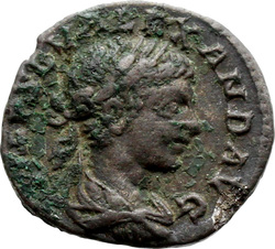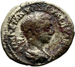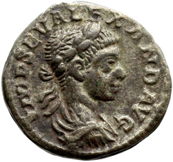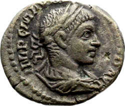 I[MP CA]ES [M AVR] ANTONINVS PIVS AVG, Bust of Elagabalus, horned, laureate, draped, right