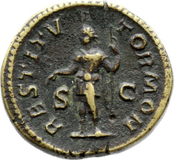 FELICI[TAS] PVBLICA S C, Felicitas, draped, standing front, head left, legs crossed, holding caduceus in right hand and leaning on column with left arm