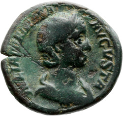 FELICI[TAS] PVBLICA S C, Felicitas, draped, standing front, head left, legs crossed, holding caduceus in right hand and leaning on column with left arm