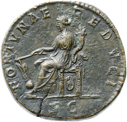FORTVNAE REDVCI S C, Fortuna, draped, seated left on low seat, holding rudder set on globe in right hand and cornucopiae in left hand; under seat, wheel