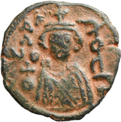obscured (KAΛON), Emperor standing and facing, in right hand a long cross and in left hand a globus cruciger, partially obscured Greek inscription to right upwards, Arabic inscription to left downwards, all enclosed by beaded circle
