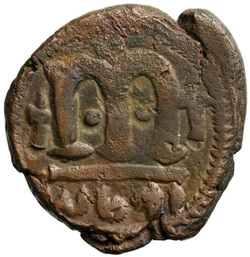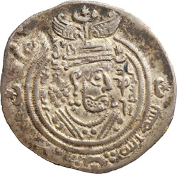 AFZWT GDH / APDWLA / Y HMAN (Z omitted), Bust of Khusraw II facing right, to left downwards Pahlavi inscription, to right downwards Pahlavi inscription (ruler name), earring: three pellet triangle, breast ornamentation: three pellet triangle, enclosed by double beaded circle, margin divided into four quadrants by star-and-crescents, Arabic inscription in second quadrant with other quadrands unknown due to break, followed by triangle of three pellets, countermarks in third and four quadrants as well as on star-and-crescent at 3h
