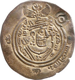AFZWT GDH, Bust of Khusraw II facing right, Pahlavi inscription to left downwards, Bactrian inscription to right downwards (ruler) facing inwards, earring: three pellet triangle, breast ornamentation: three pellet triangle, enclosed by double beaded circle, margin in four quadrants separated by star-and-crescents, tamga in first quadrant, Arabic inscription clockwise in second quadrant followed by three pellet triangle, Pahlavi inscription in third quadrant preceded by three pellet triangle
