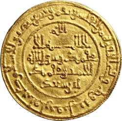 لا اله الا الله / محمد رسول الله / المستنصر بالله / امير المؤمنين, two facing heads turned slightly to left and right, Arabic inscription in four segments, in order top, bottom, right and left, all enclosed by beaded circle