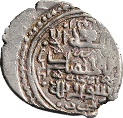 خلد ملكه / ضرب سرز, Arabic inscription in field, divided into two horizontal segments by two parallel lines, with a decorative element on the top band, enclosed by a linear circle