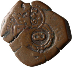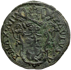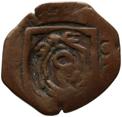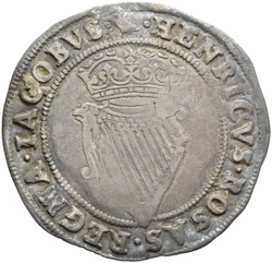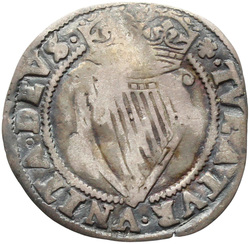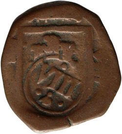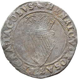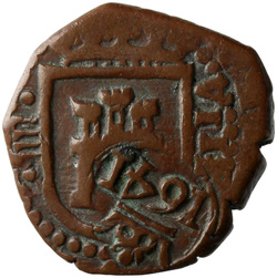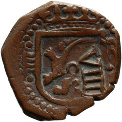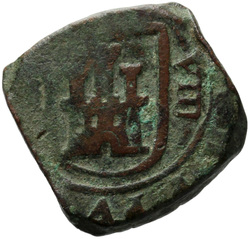 HISPANIARVM REX, Crowned shield of Leon, date to the right, (illegible), arches of Segovia to the left.