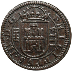 PHILIPPVS III D G, Crowned shield of Castile, value in roman numerals to the right, arches of Segovia to the left.
