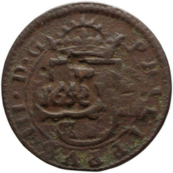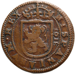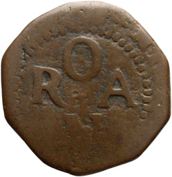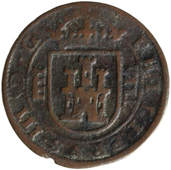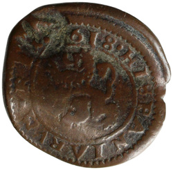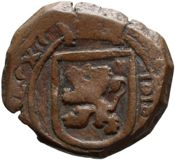 A[ ] ELISABE[ ] DEI G[ ]A (tree) 16(crown)18, Cross fleury with quartrfoil centre enclosing a lion, date and crown above; initial mark: tree