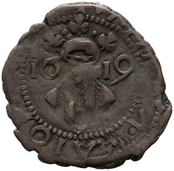 ALBERTVS [ ] ELISABET DEI GRATIA 16 (hand) 19, Bare-headed bust of Albert (front) and Isabelle (behind) facing right; initial mark: hand